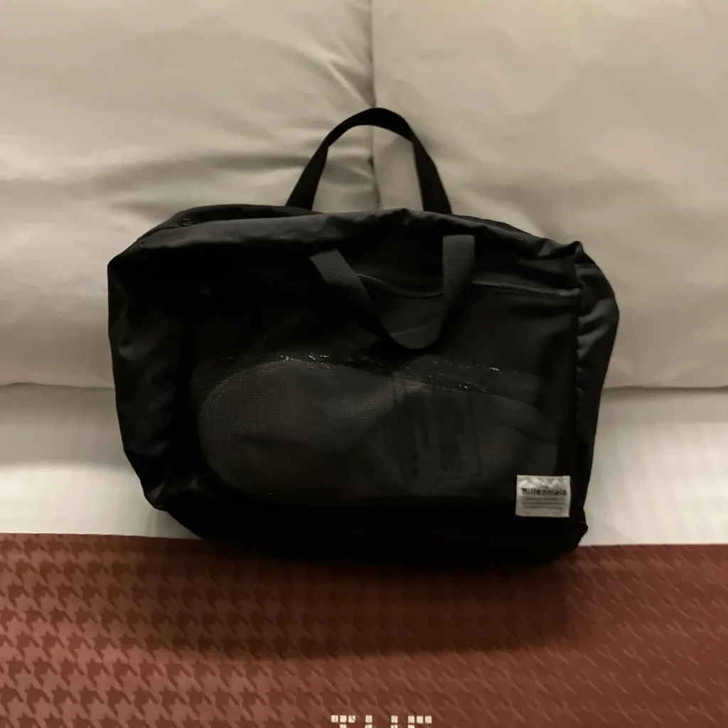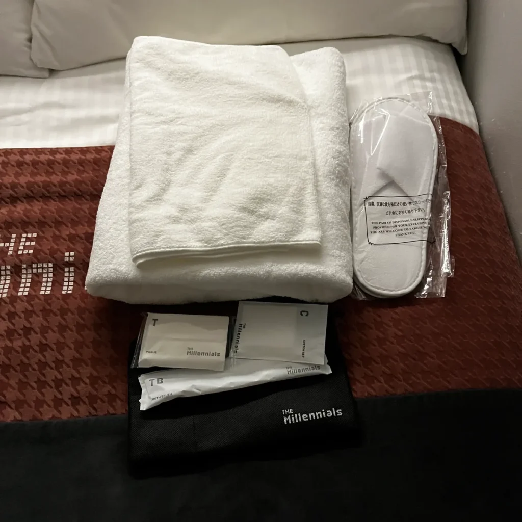 체크인하면 침대 위에 수건과 일회용슬리퍼, 칫솔 등이 담긴 목욕가방이 있는데 샤워하러 갈 때 수건과 칫솔 등을 챙겨서 들고가면 떨어뜨릴 일이 없어서 유용하게 쓴 목욕가방이에요!