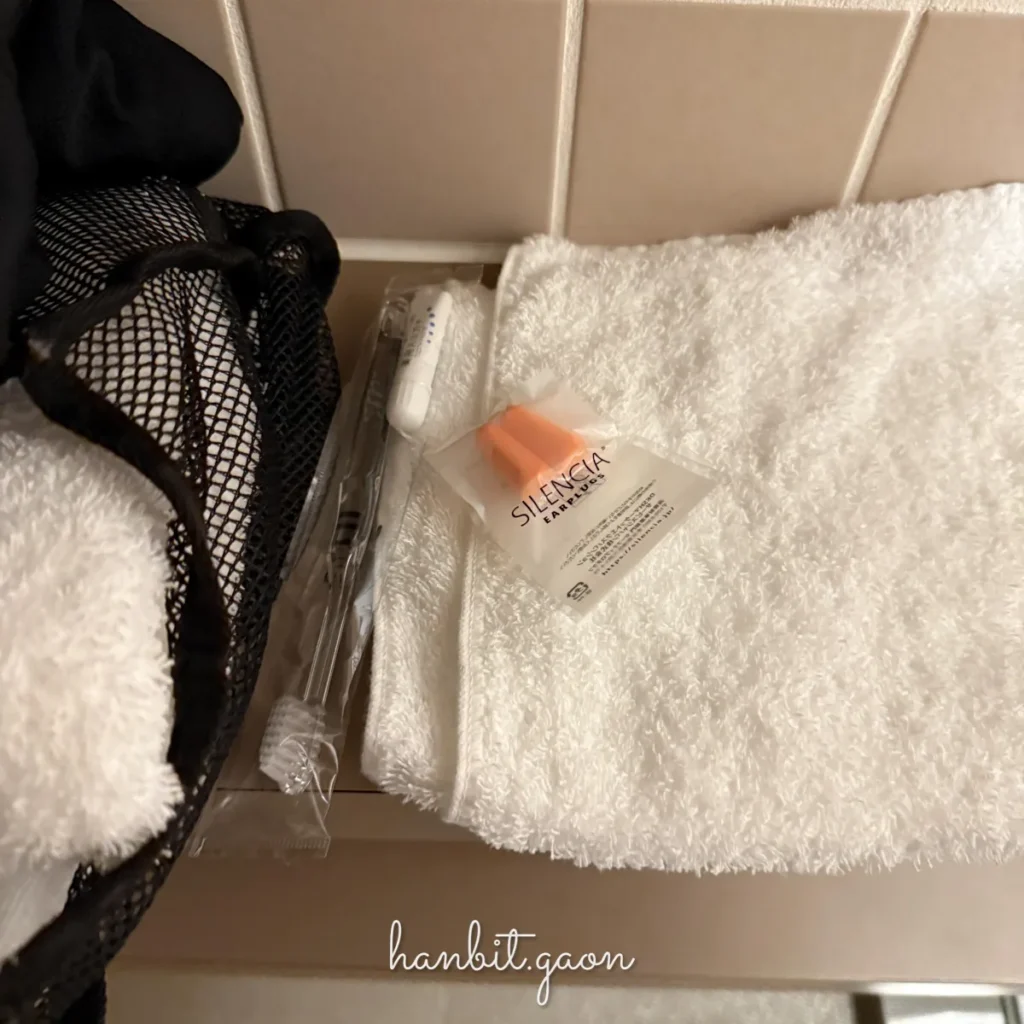 ✅ 구성: 수건 2장(큰 거, 작은 거), 발닦개, 실내복(파자마, 상하의 각각), 일회용 슬리퍼, 칫솔, 이어플러그(귀마개)