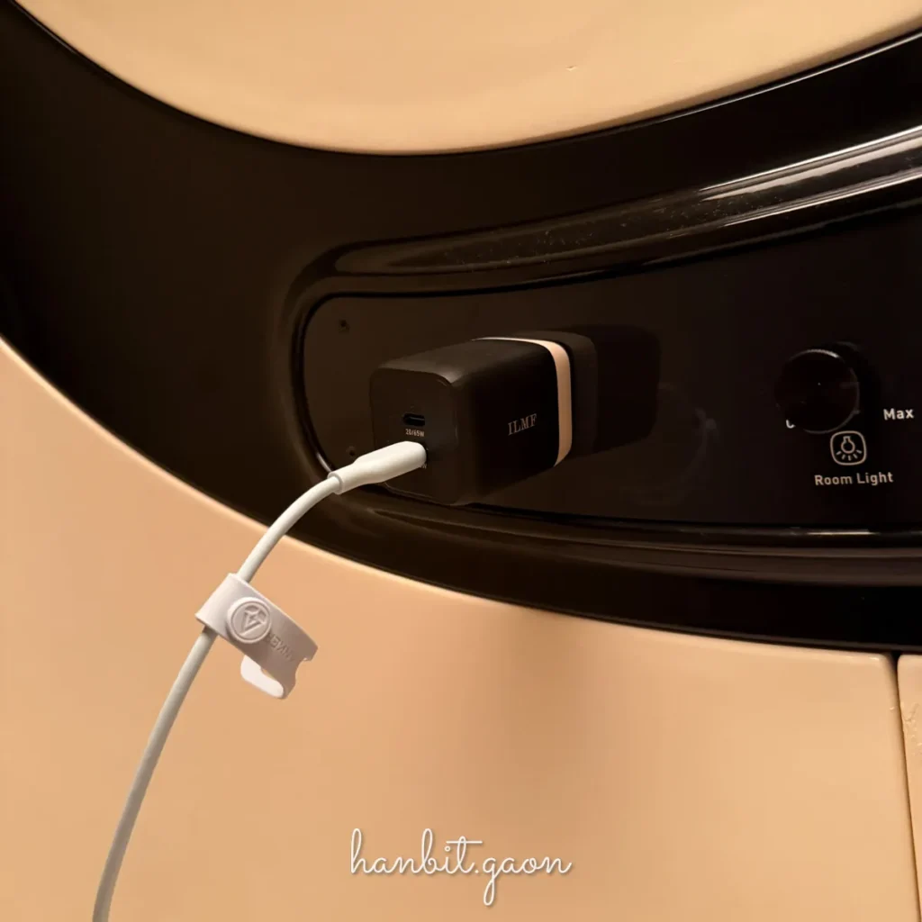 왼쪽의 콘센트는 90도로 돌려서 꽂는 형태, 오른쪽의 USB포트는 A타입이에요.