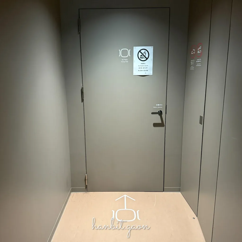 로커와 함께 세면대가 있는 구조인데, 세면대 오른쪽에 캡슐룸으로 갈 수 있는 문이 있어요.