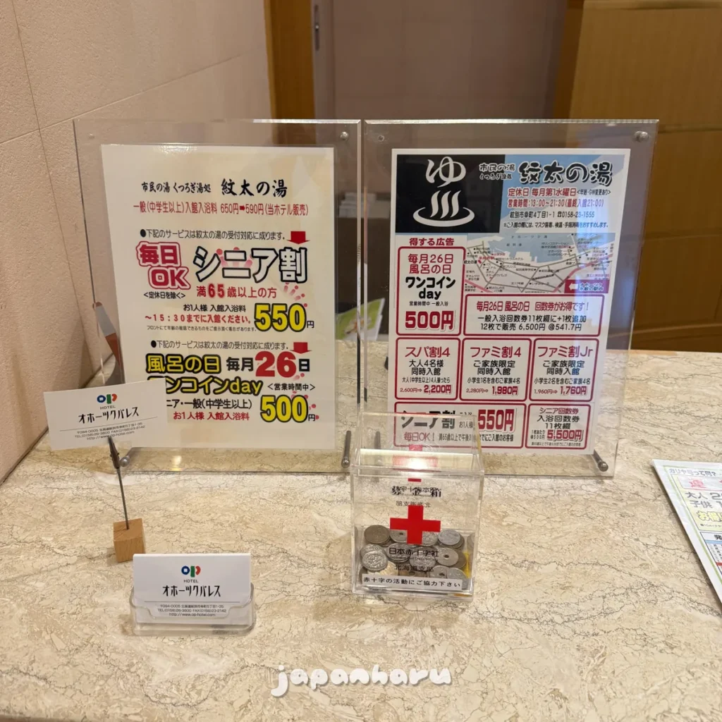 그래서 그런지 호텔 프론트에서는 근처에 있는 몬베쓰의 유일하다시피 한 목욕탕인 ‘몬타노유’의 입욕권을 할인된 가격으로 판매하고 있어요.