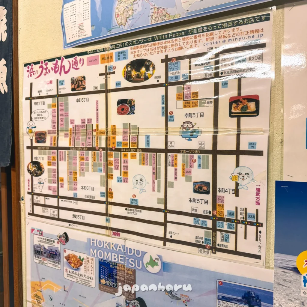 기다리는데 벽면에 몬베쓰 시내의 식당 지도가 걸려있어요.