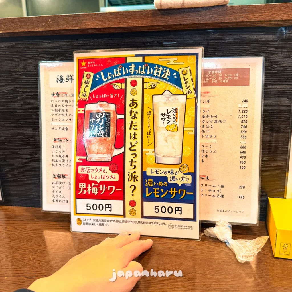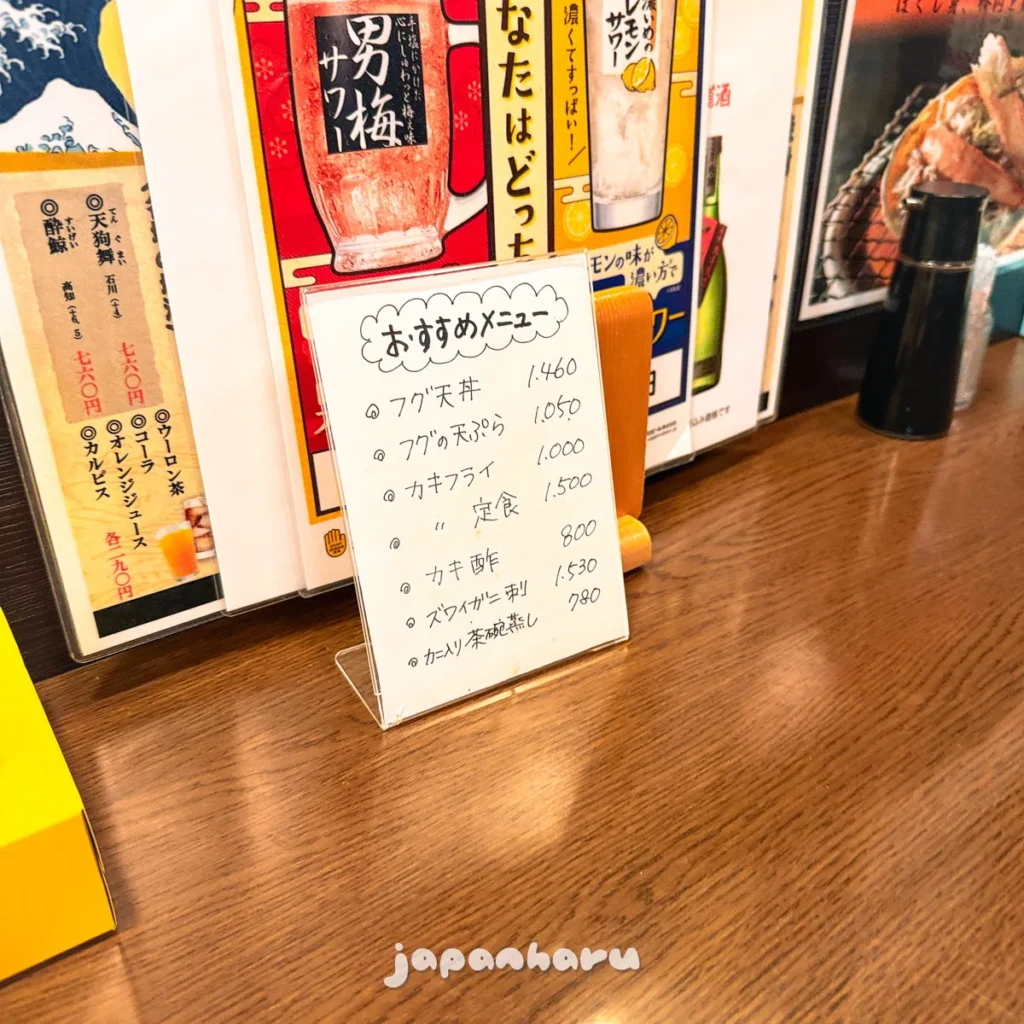 이자카야답게 추천 메뉴나 벽에 붙은 메뉴도 살펴봐요.