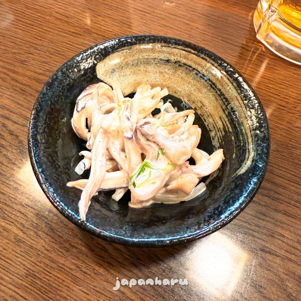 첫 메뉴는 ‘하룻밤 말린 오징어’라는 이름의 메뉴에요.(메뉴 이름은 대충 번역했어요… 😅)