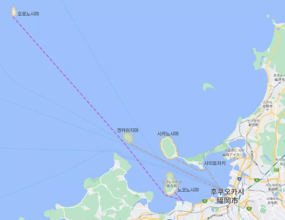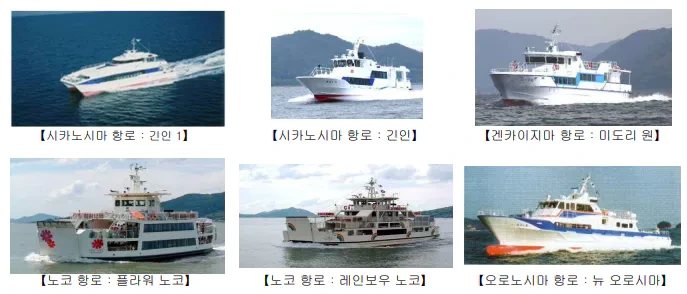 후쿠오카에서 주변 섬으로 가는 노선은 위와 같은데, 후쿠오카에 있는 2개의 선착장(하카타부두/메이노하마)에서 출발해 사이토자키/시카노시마/겐카이지마/노코노시마/오로노시마로 가는 항로가 있어요.