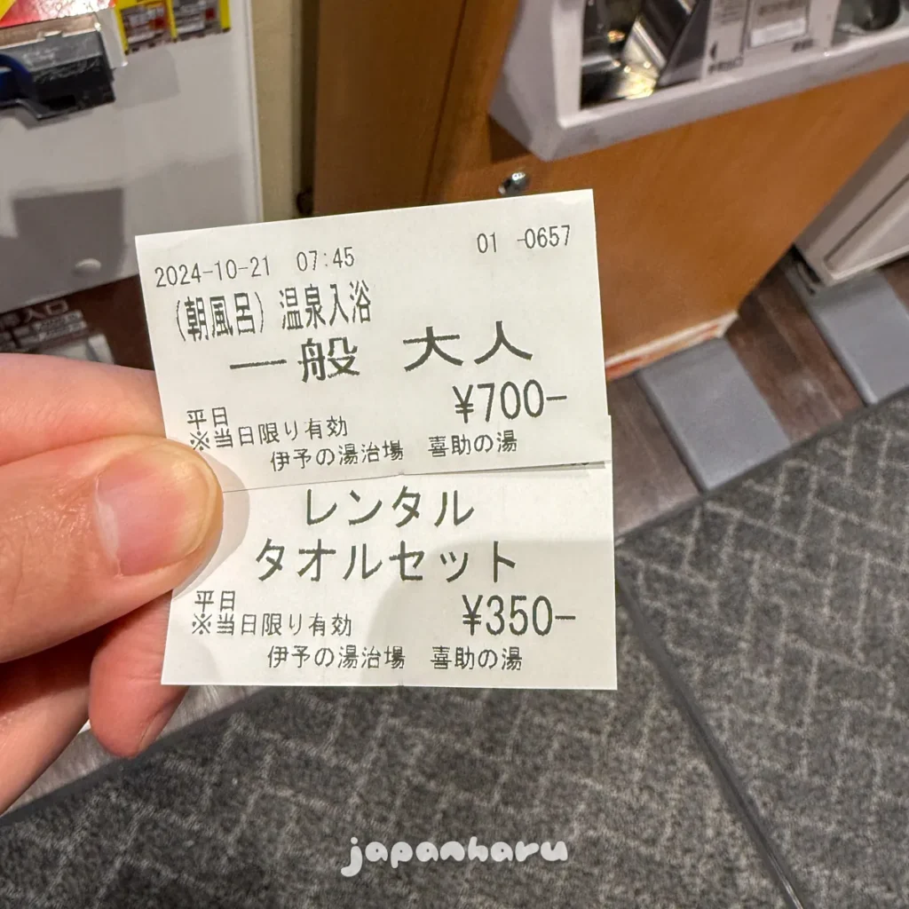 아침목욕 입욕권(700엔)과 렌탈 타올세트(350엔)로 했어요.
