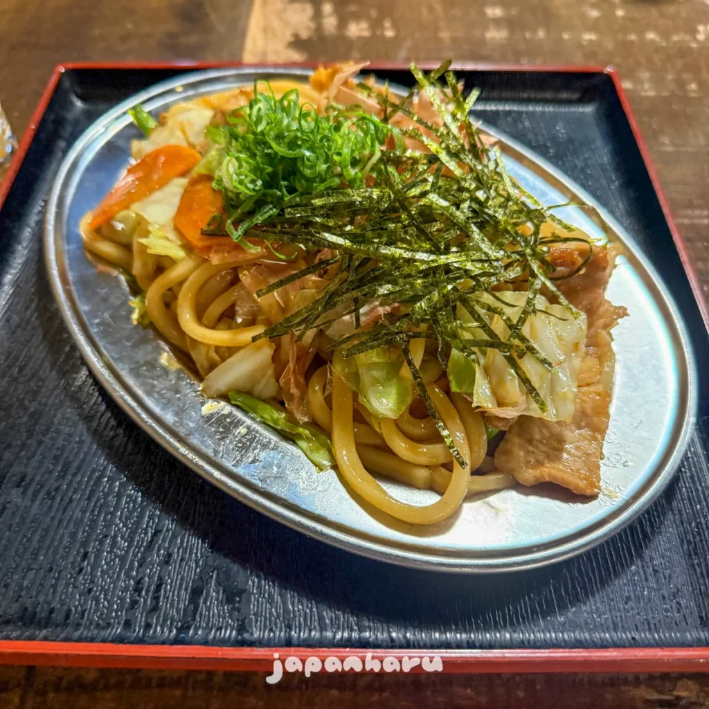 우동과 고기, 양배추 등을 소스에 볶아 그 위에 김가루와 가쓰오부시, 잘게 썬 파를 올려놓았네요.