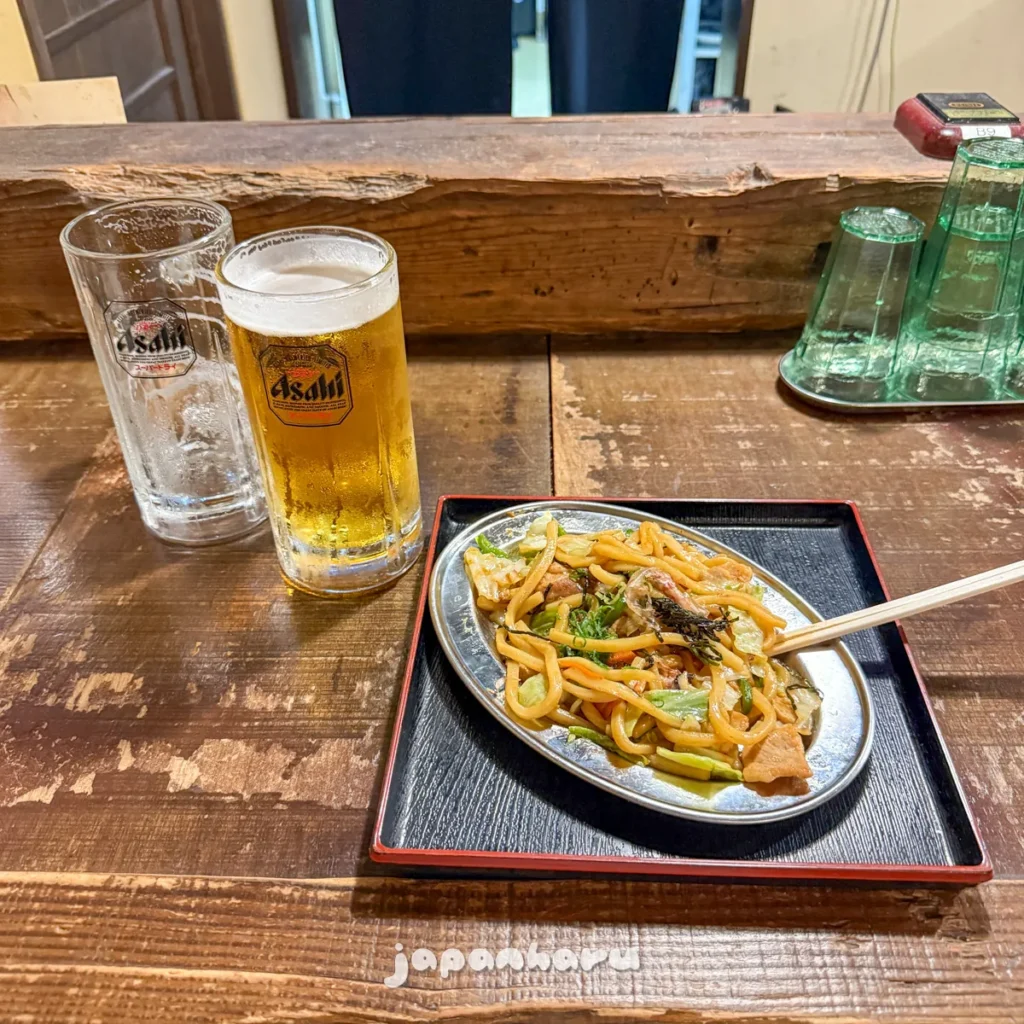 식당 입구에서 보였던 ‘야키우동’이 괜찮아 보여서 맥주와 함께 주문했어요.