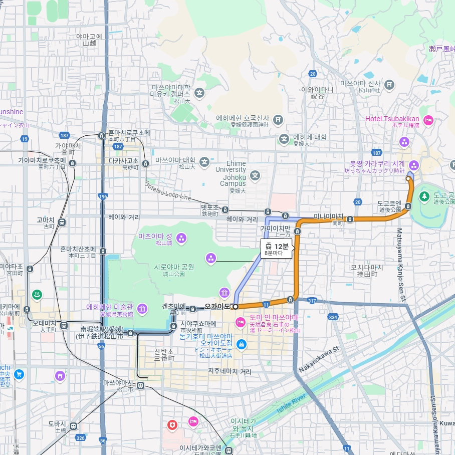 마쓰야마의 최대 번화가라 할 수 있는 오카이도 주변에서 마쓰야마성을 구경하고 노면전차를 타고 마쓰야마 온천의 중심지라 할 수 있는 도고온센으로 향했어요.