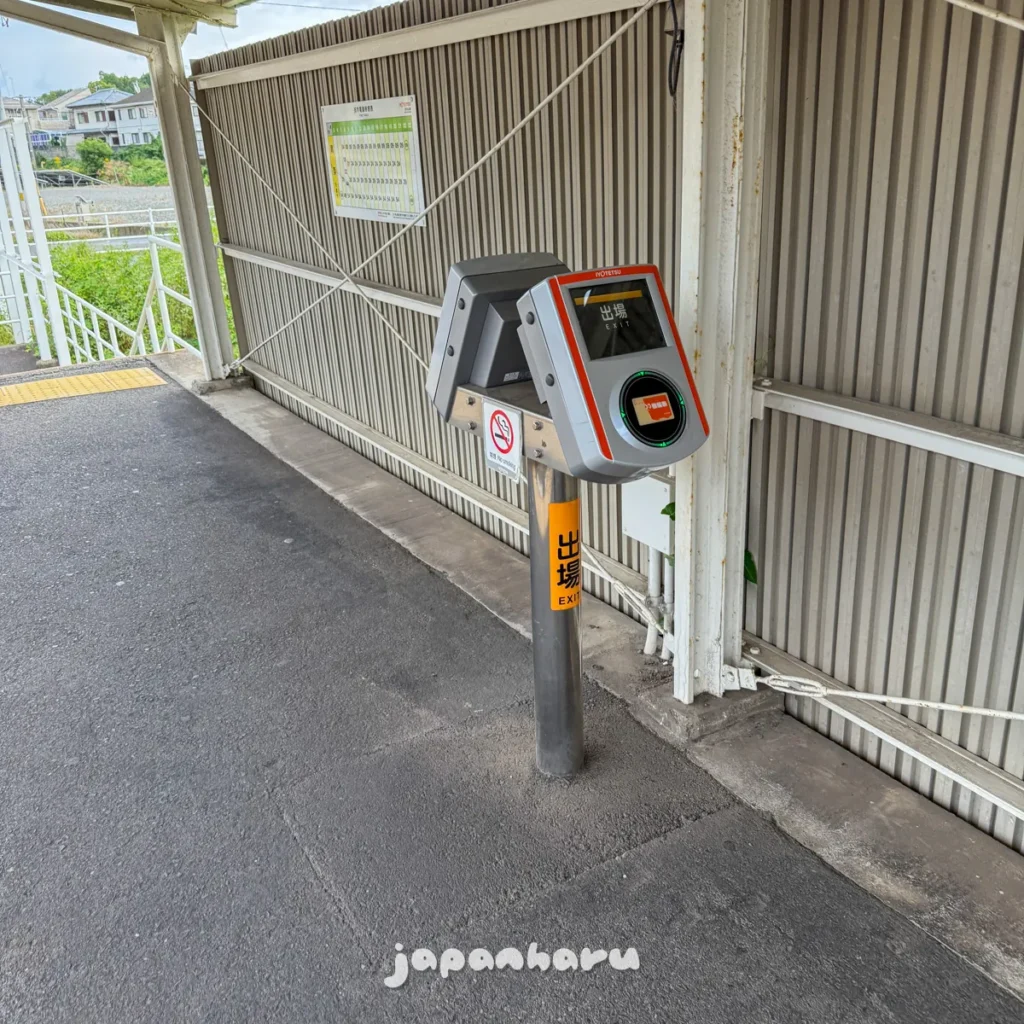 역 승강장에 보면 이렇게 교통카드를 터치할 수 있는 단말기가 있는데, 이 단말기에 쓸 수 있는 교통카드는 여기 전용카드인 ‘IC이~카드’라는 이요테츠 자체 카드에요.