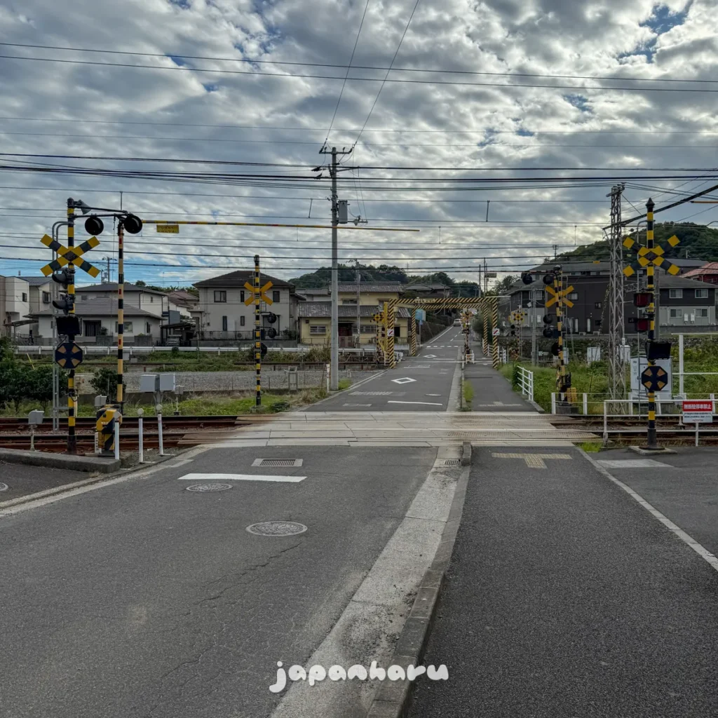 아까 승강장을 건너간 길을 건너, JR의 열차가 지나는 선로도 지나요.