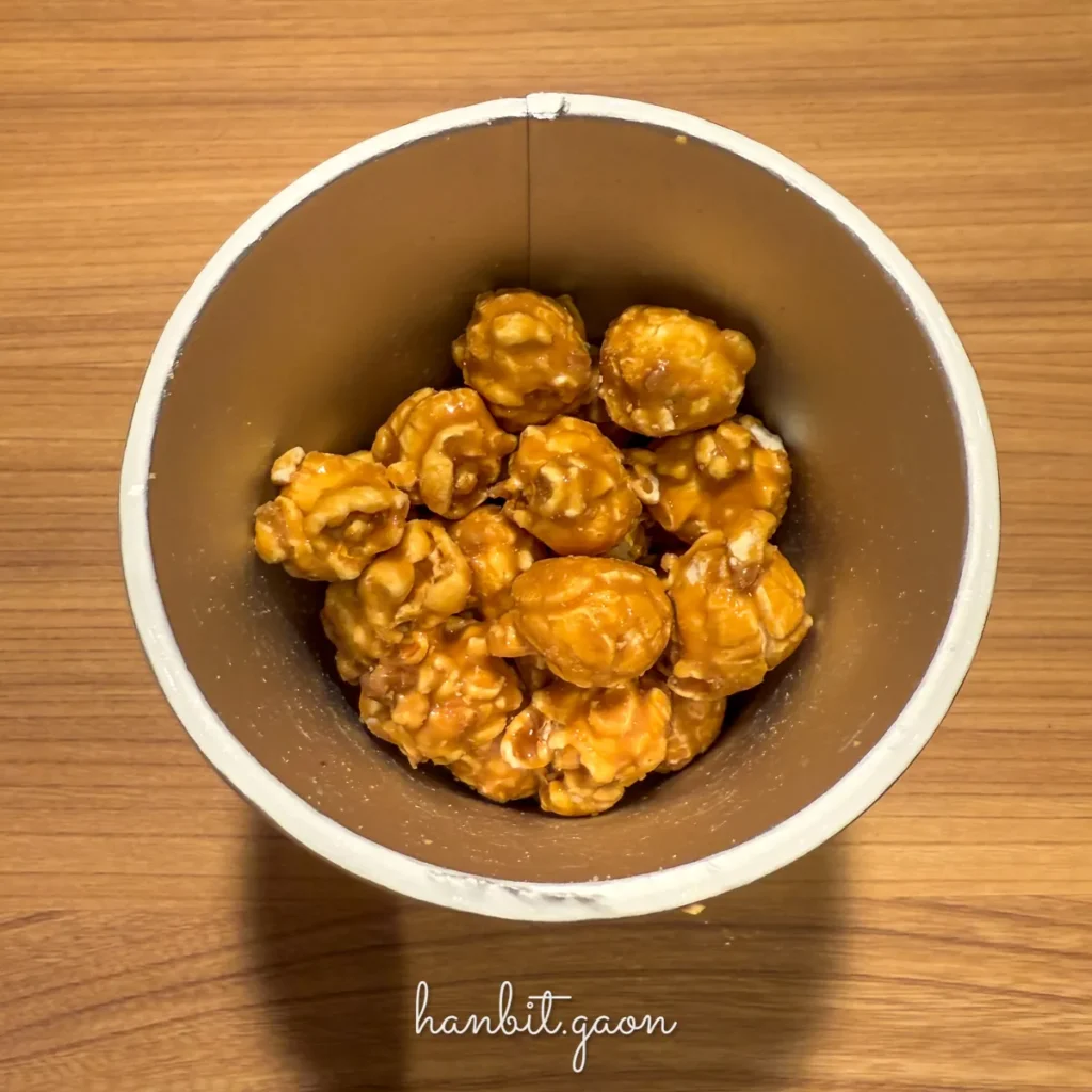 캬라멜 팝콘을 먹다보면 가끔 캬라멜이 약하게 코팅된 팝콘일 때는 아쉬움이 있었는데, 이건 맛있네요 ☺️