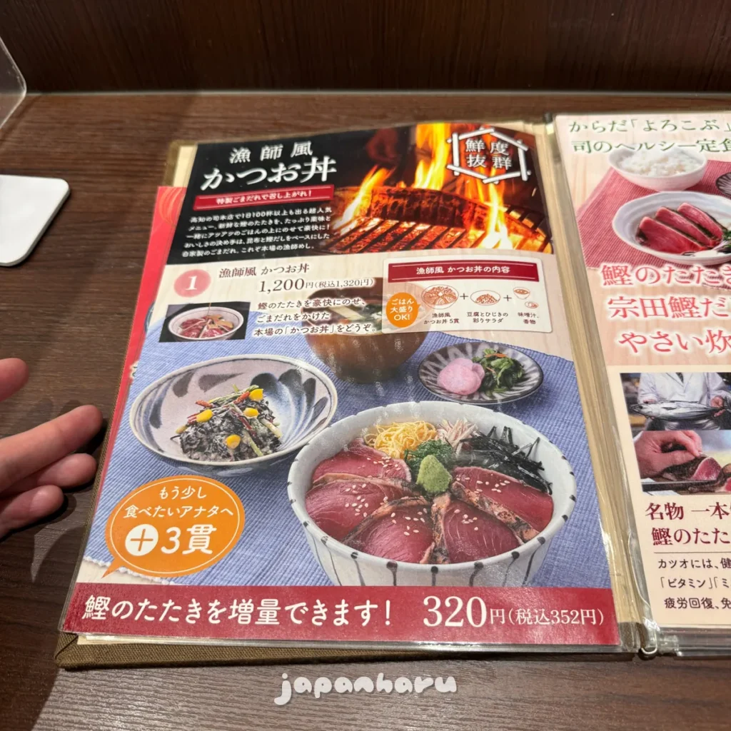 가쓰오 타다끼를 올린 덮밥인 가쓰오동을 주문!