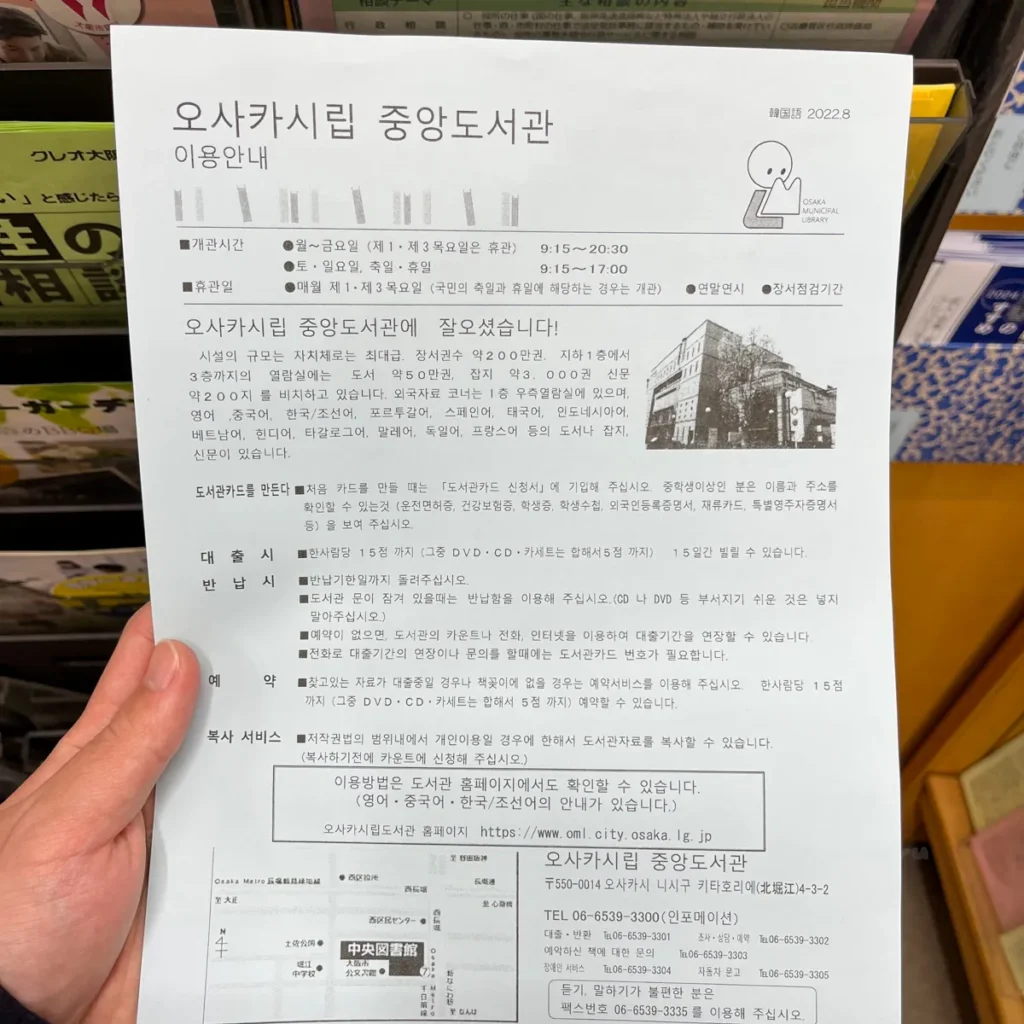 📍 제가 묵던 곳에서 비교적 가까운 곳에 위치한 도서관은 ‘오사카시립 중앙도서관’이었어요.