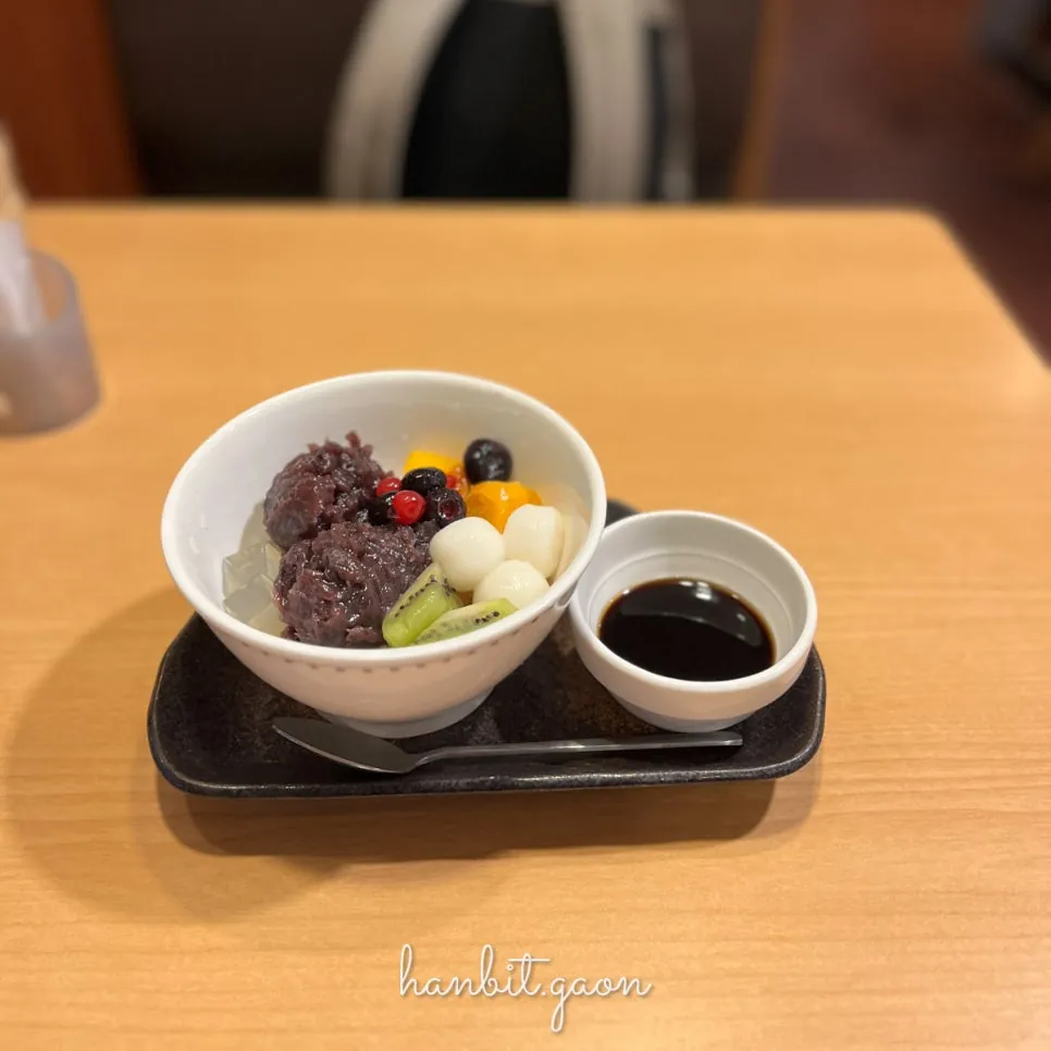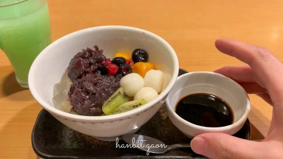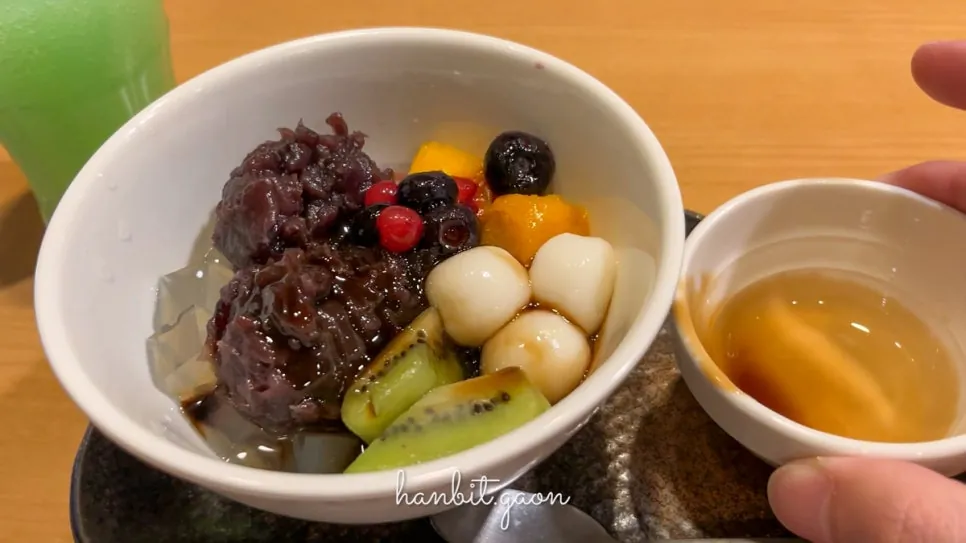 설명대로 팥소와 우무, 찹쌀떡 그리고 다양한 과일이 얹어져있네요.