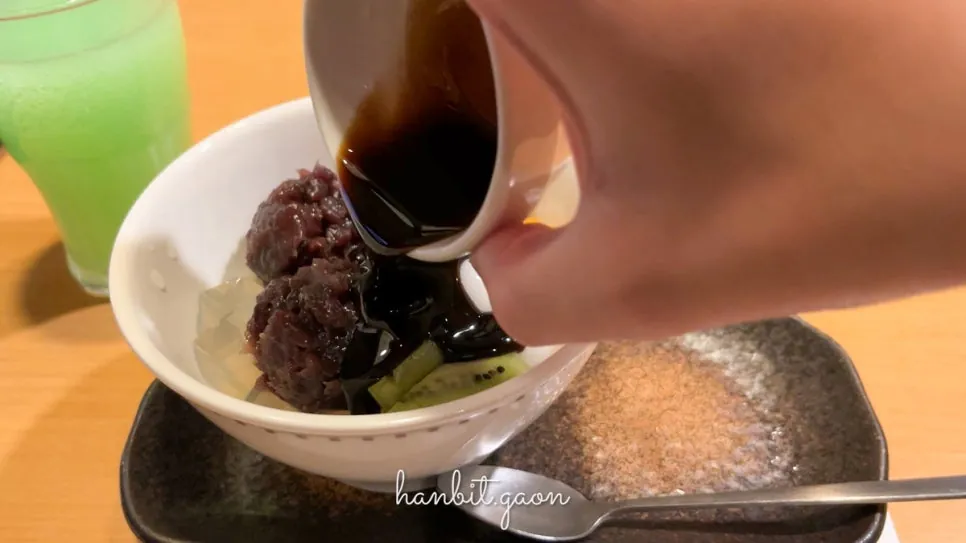 깨알상식으로 안미츠에 대해 알아보자면, 안미츠(あんみつ)는 팥소(앙꼬), 한천(우무), 완두콩, 찹쌀떡, 과일 등에 꿀 또는 시럽을 뿌려서 먹는 화과자의 일종이라고 해요.