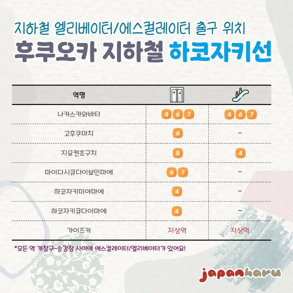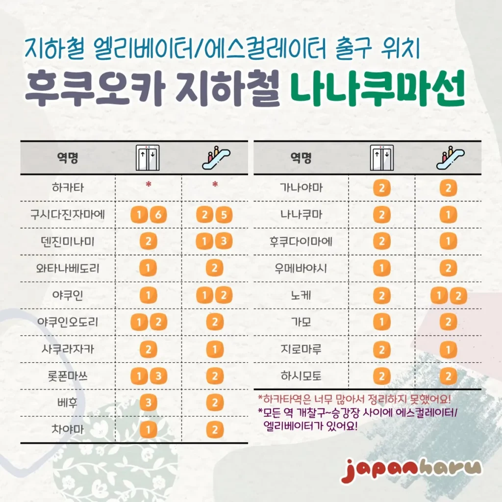 📌 후쿠오카시 지하철은 모든 역에 승강장층과 개찰구층 사이에는 에스컬레이터와 엘리베이터가 있다고 적혀있었으니 그 부분은 따로 역별로 적지 않았어요!