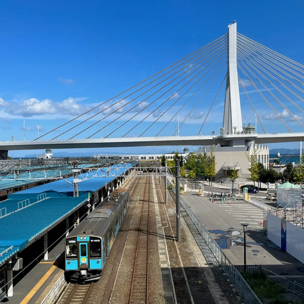 아오모리역에서는 큰 다리 ‘아오모리 베이브리지’가 보여요.