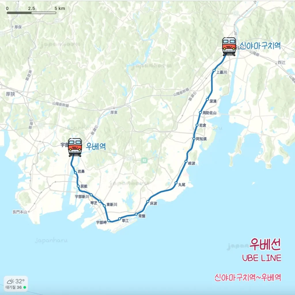– 구간: 신야마구치역~우베역(33.2km, 18개 역)