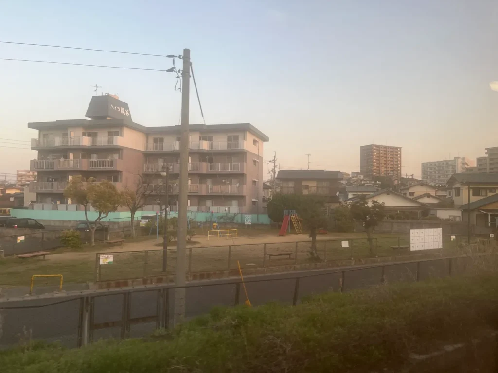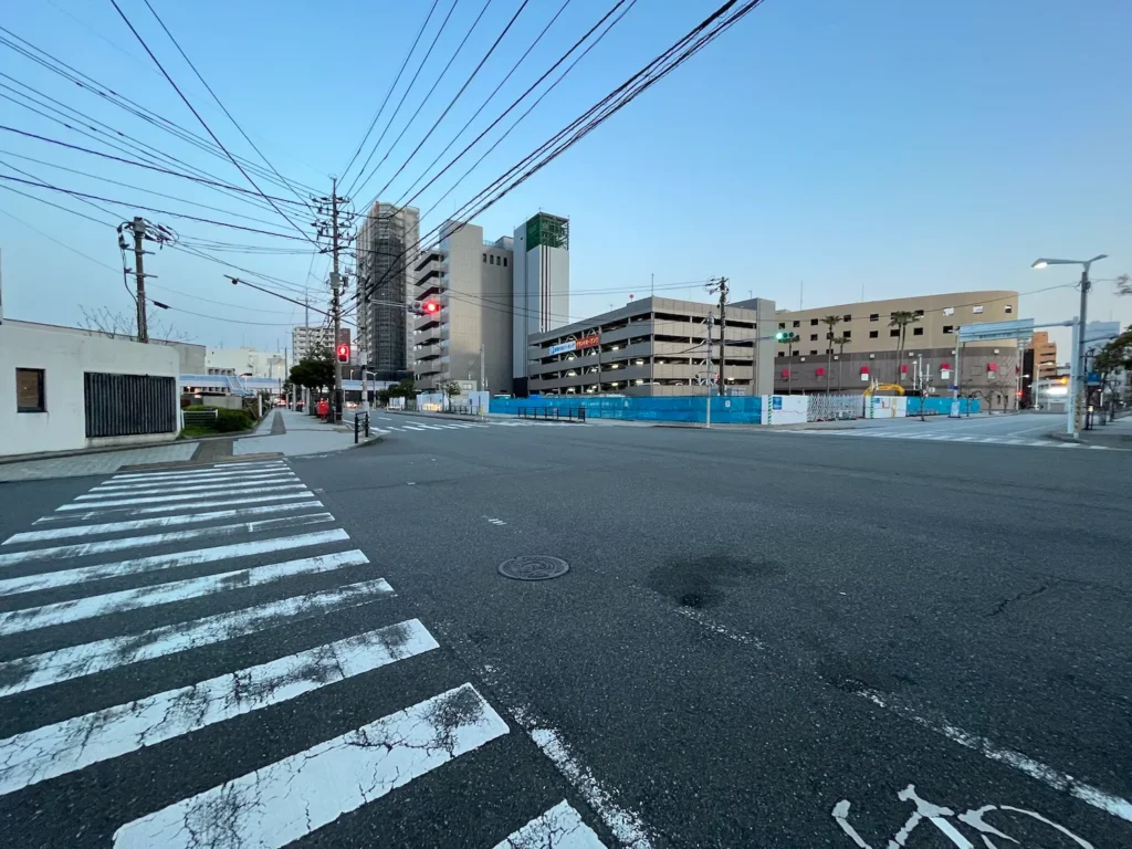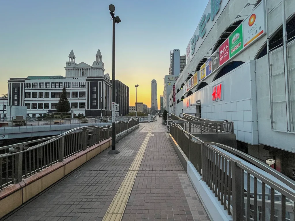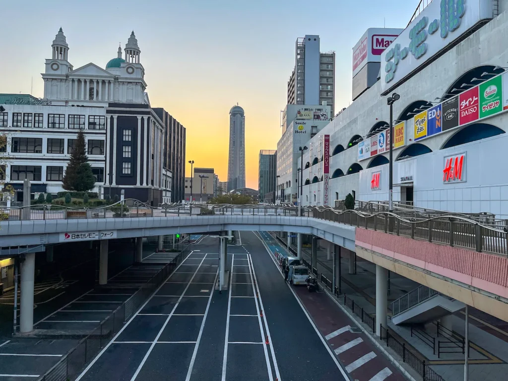 육교? 고가를 올라가니 저 멀리 카이쿄유메타워가 보이고 그 뒤로 노을이 보이네요.