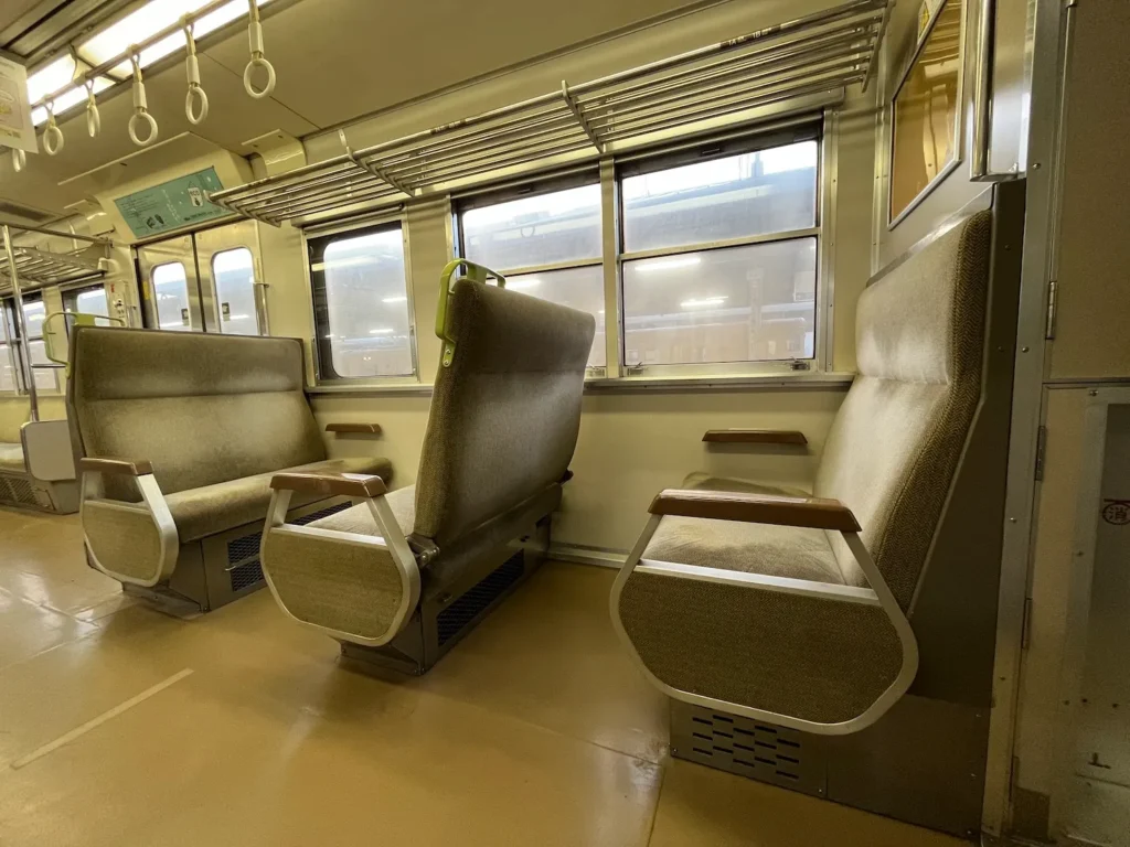 의자 등받이 위에 있는 손잡이를 잡고 옆으로 밀면 등받이가 이동하는 방식이죠. 저도 작년 11월에 다자이후로 가는 열차에서 처음 알게 되었어요.