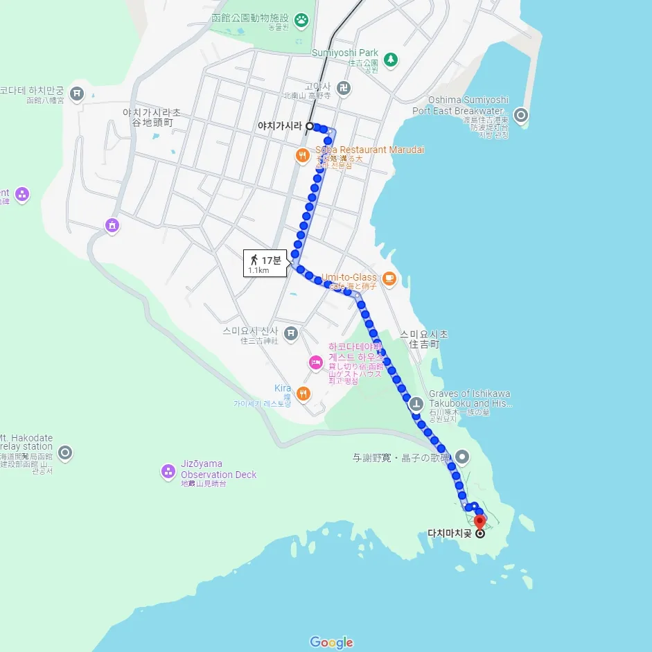 야치가시라 정류장에서 다치마치곶까지는 약 15~20분 정도 걸어가야 해요.
