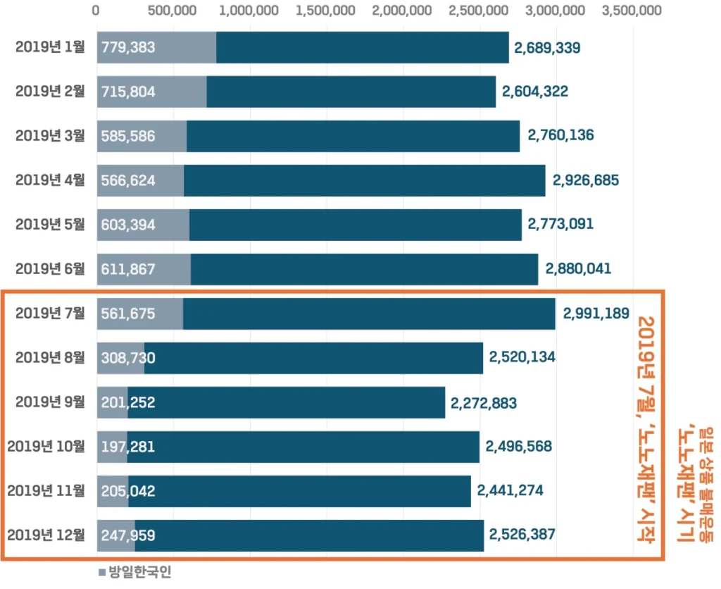 2019년 7월부터 12월까지는 한국의 일본 상품 불매운동(노노재팬)으로 방일한국인 수가 급감하였어요.