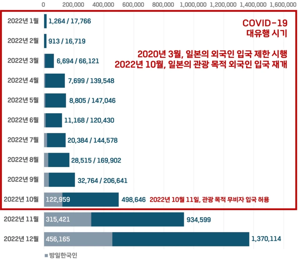 ❷ 코로나19: 전세계적인 코로나19 대유행 여파로 일본 정부의 외국인 입국 제한을 시행함에 따라 방일외국인 수가 크게 감소하였어요(2020년 3월 시행, 2022년 10월 11일 관광 목적 무비자 입국 허용)