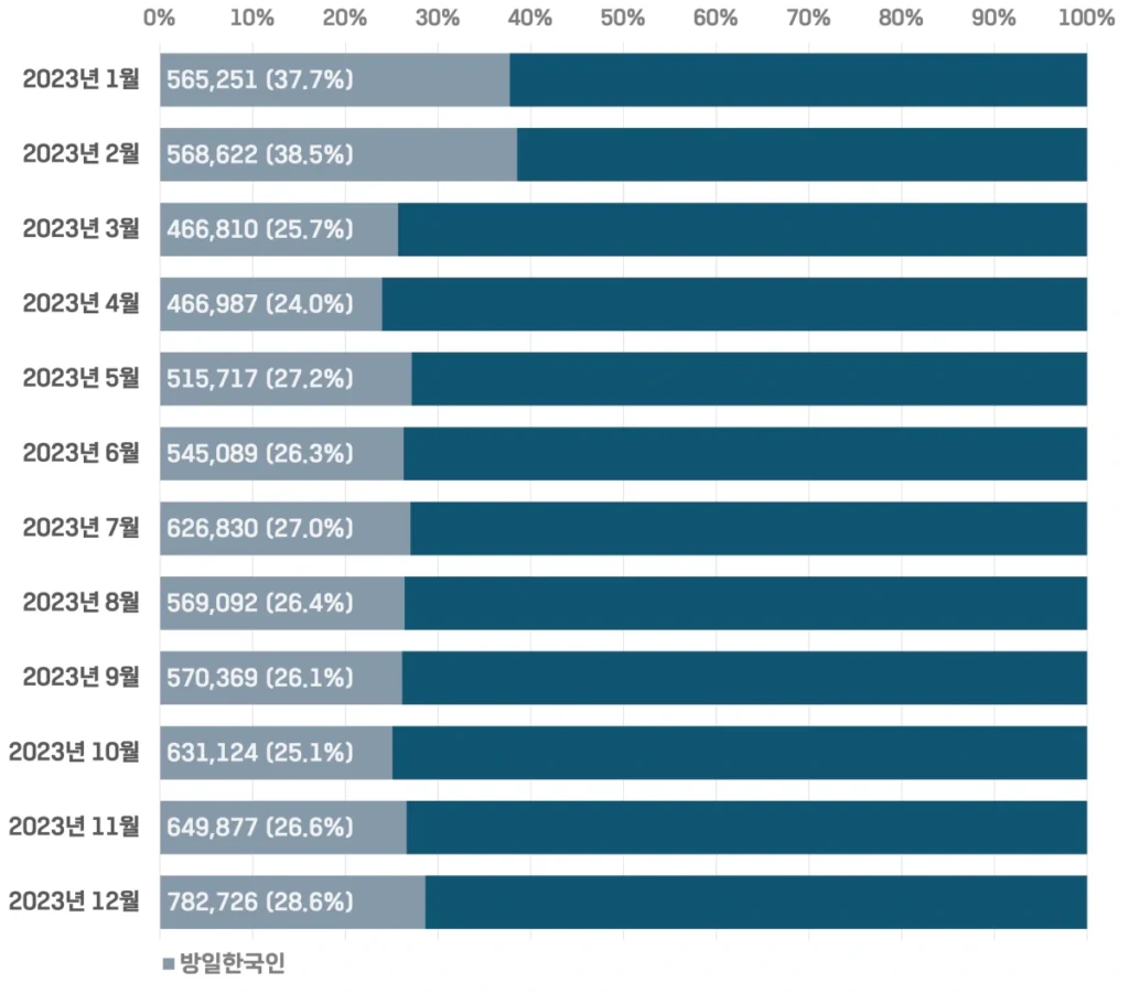 방일외국인 대비 방일한국인은 월별로 보면 1월과 2월에는 38% 정도를 차지했고, 나머지 3~12월은 25~28% 정도를 차지한 것으로 보여지네요.