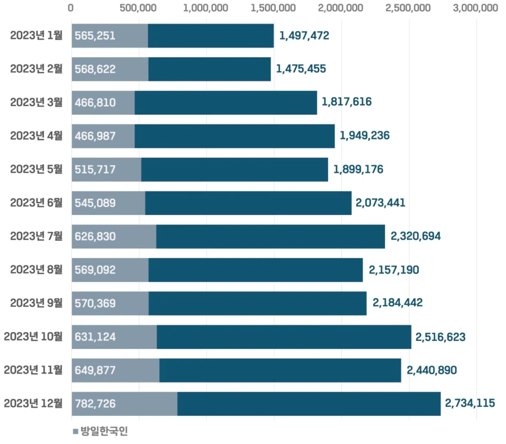 일본의 관광 목적 무비자 입국이 재개된 10월 이후의 11월과 12월의 2개월만 보면 방일외국인은 2,304,713명, 그 중 방일한국인은 771,586명으로 전체 방일외국인의 33.5%를 차지했어요.