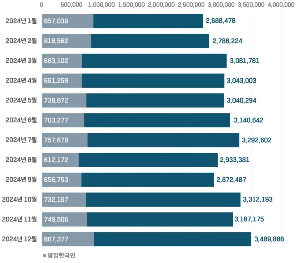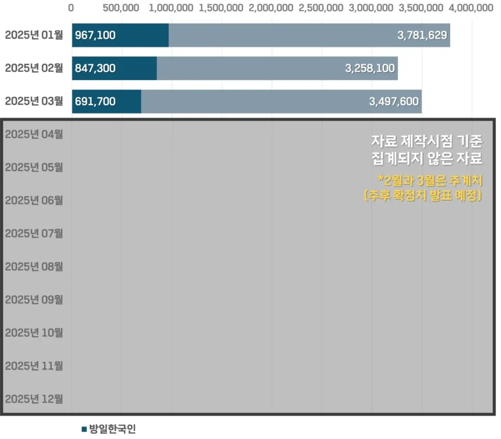 2025년 1월, 처음으로 월별 방일한국인 수가 90만 명을 넘어섰어요.