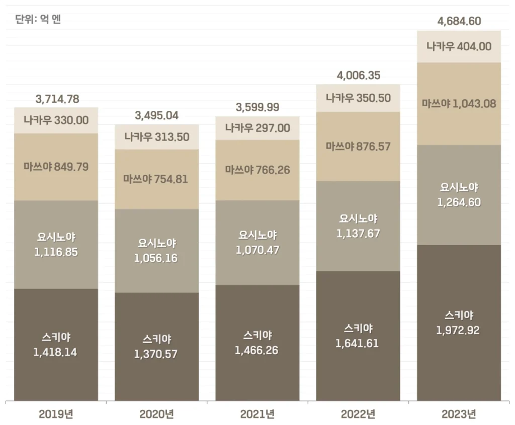 2020년에 코로나19의 영향으로 전년대비 5.9% 감소한 3,495억 400만 엔을 기록했고, 이후로 다시 회복하면서 2022년에는 4,000억 엔을 넘긴 4,006억 3,500만 엔, 2023년에는 4,684억 6000만 엔을 기록했어요.