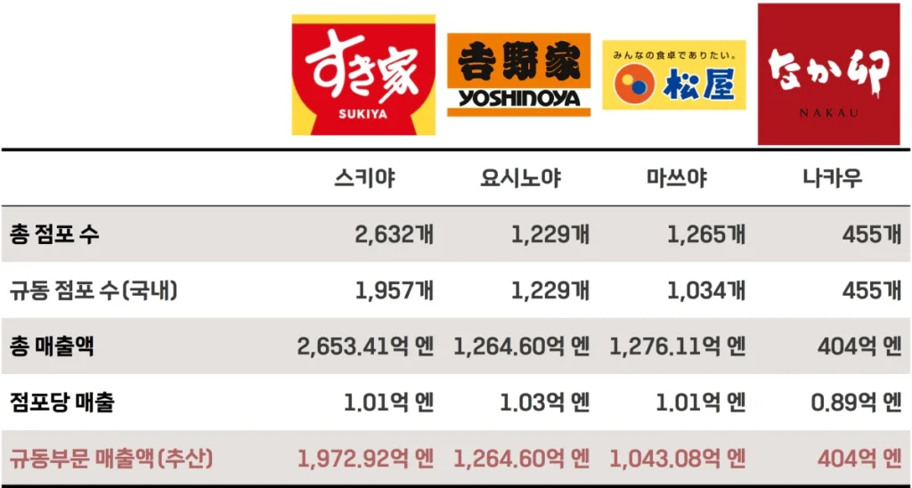 4개의 브랜드 중 ‘스키야’와 ‘나카우’는 ‘젠쇼 홀딩스(ゼンショーホールディングス)’에서 운영하는 브랜드라 같은 회사로 분류, 나머지 ‘요시노야’를 운영하는 ‘요시노야 홀딩스(吉野家ホールディングス)’, ‘마쓰야’를 운영하는 ‘마쓰야 푸드 홀딩스(松屋フーズホールディングス)’까지 총 3개 회사로 구성되어 있어요.