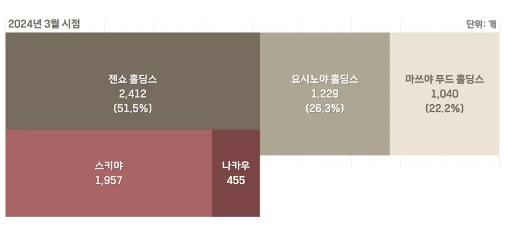 점포 수를 기준으로, ‘스키야’와 ‘나카우’를 합쳐서 총 2,412개 점포를 운영하여 51.5%의 점유율인 ‘젠쇼 홀딩스’, ‘요시노야’ 1,229개 점포를 운영하여 26.3%의 점유율인 ‘요시노야 홀딩스’, ‘마쓰야’ 1,040개 점포를 운영하여 22.2%의 점유율인 ‘마쓰야 푸드 홀딩스’ 순서로 점유율을 차지하고 있는 모습이에요.