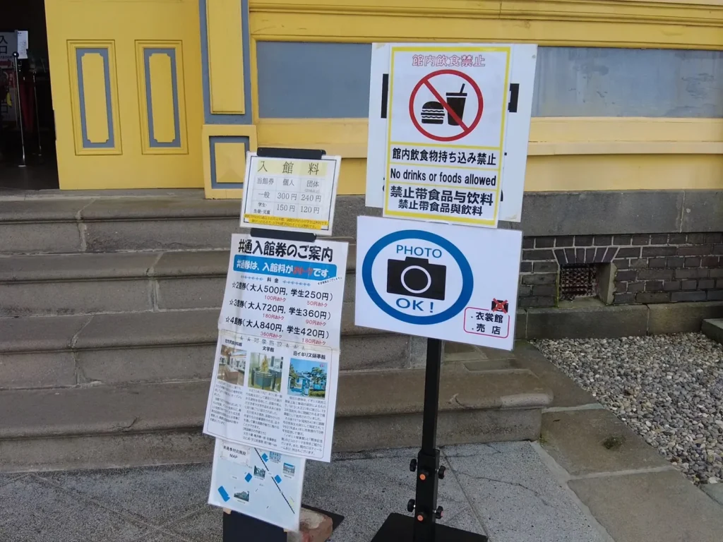 공회당 입장료는 300엔인데, 주변 관광지와 묶어서 2곳 세트(500엔), 3곳 세트(720엔), 4곳 세트(840엔)로도 판매하네요.