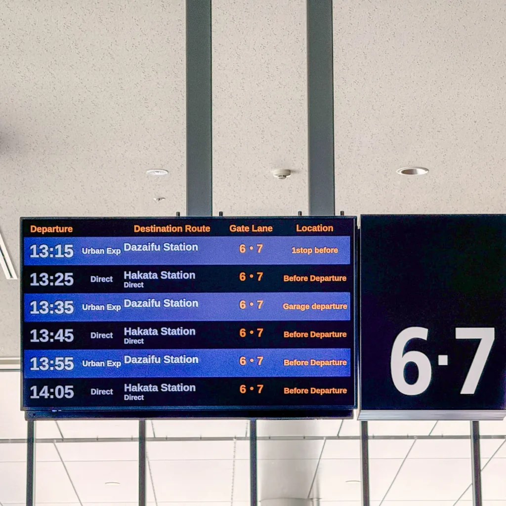 6·7번 승강장은 다자이후로 가는 버스(라이너 버스), 라라포트로 가는 버스도 탈 수 있는 곳이니 버스 행선지를 꼭 확인하고 타세요!