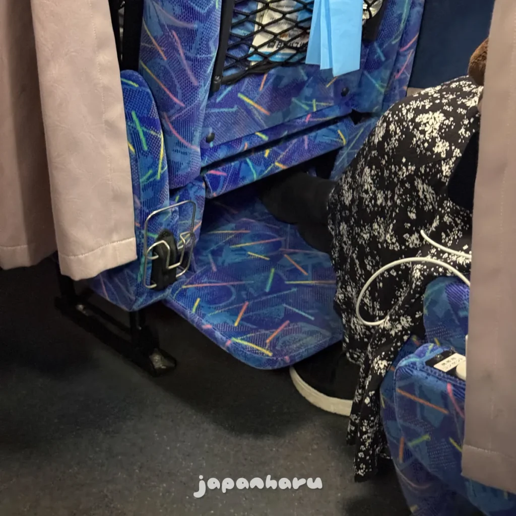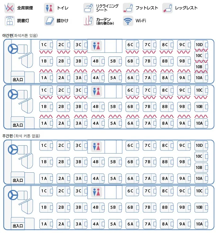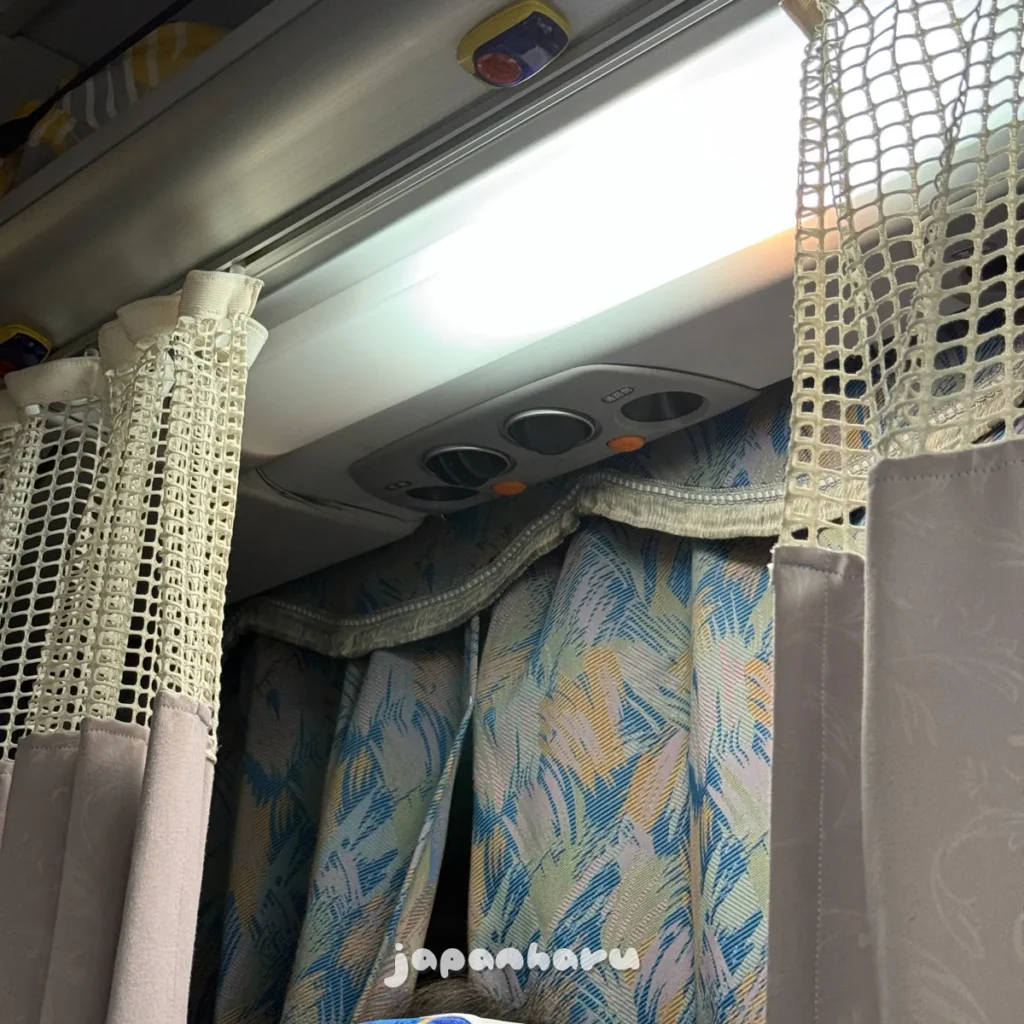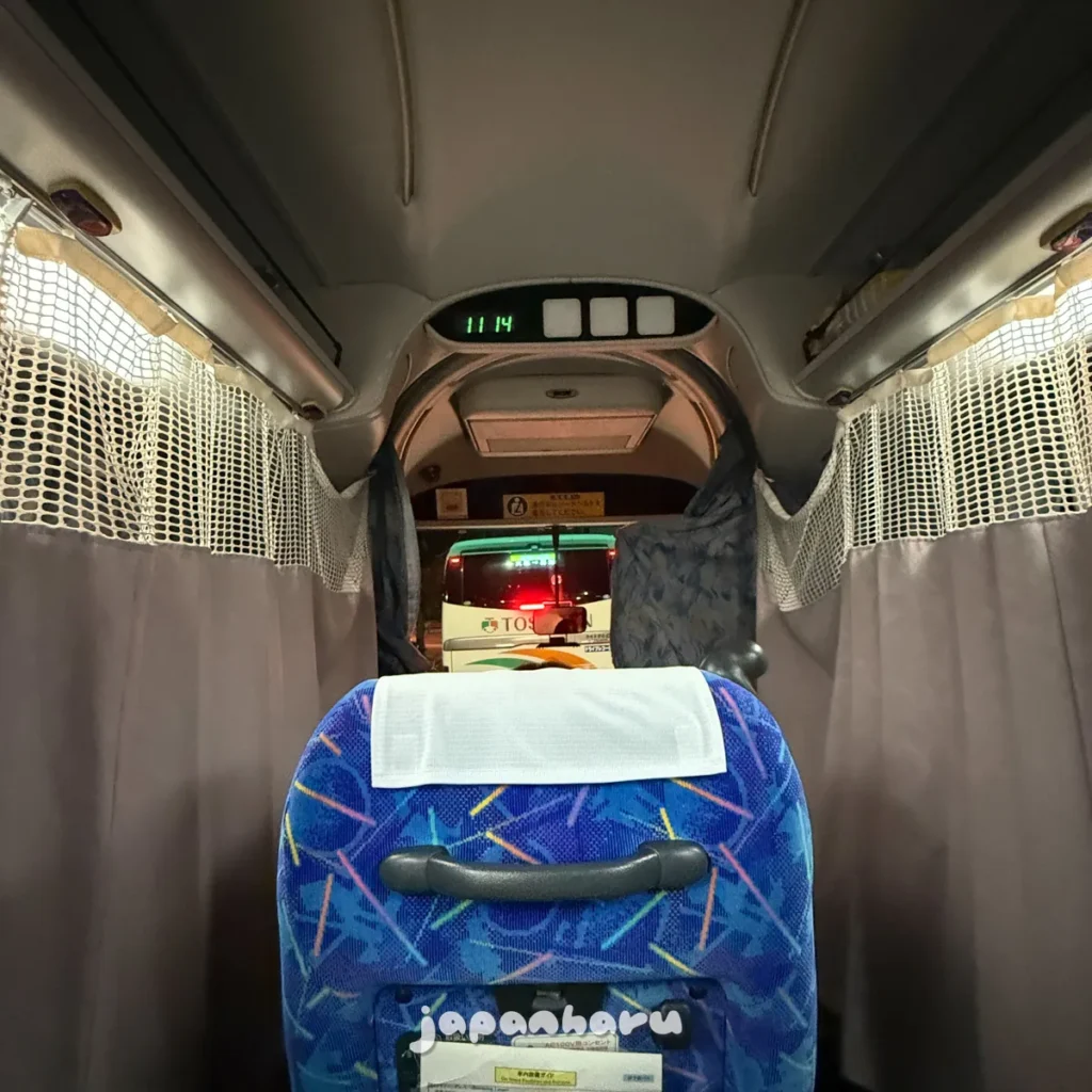 오사카-마쓰야마 노선은 고속버스와 야간버스 모두 있는 노선인데, 주간편(고속버스)은 좌석 사이의 커튼이 없고 야간편(야간버스)은 좌석 사이의 커튼이 있는 차이에요.