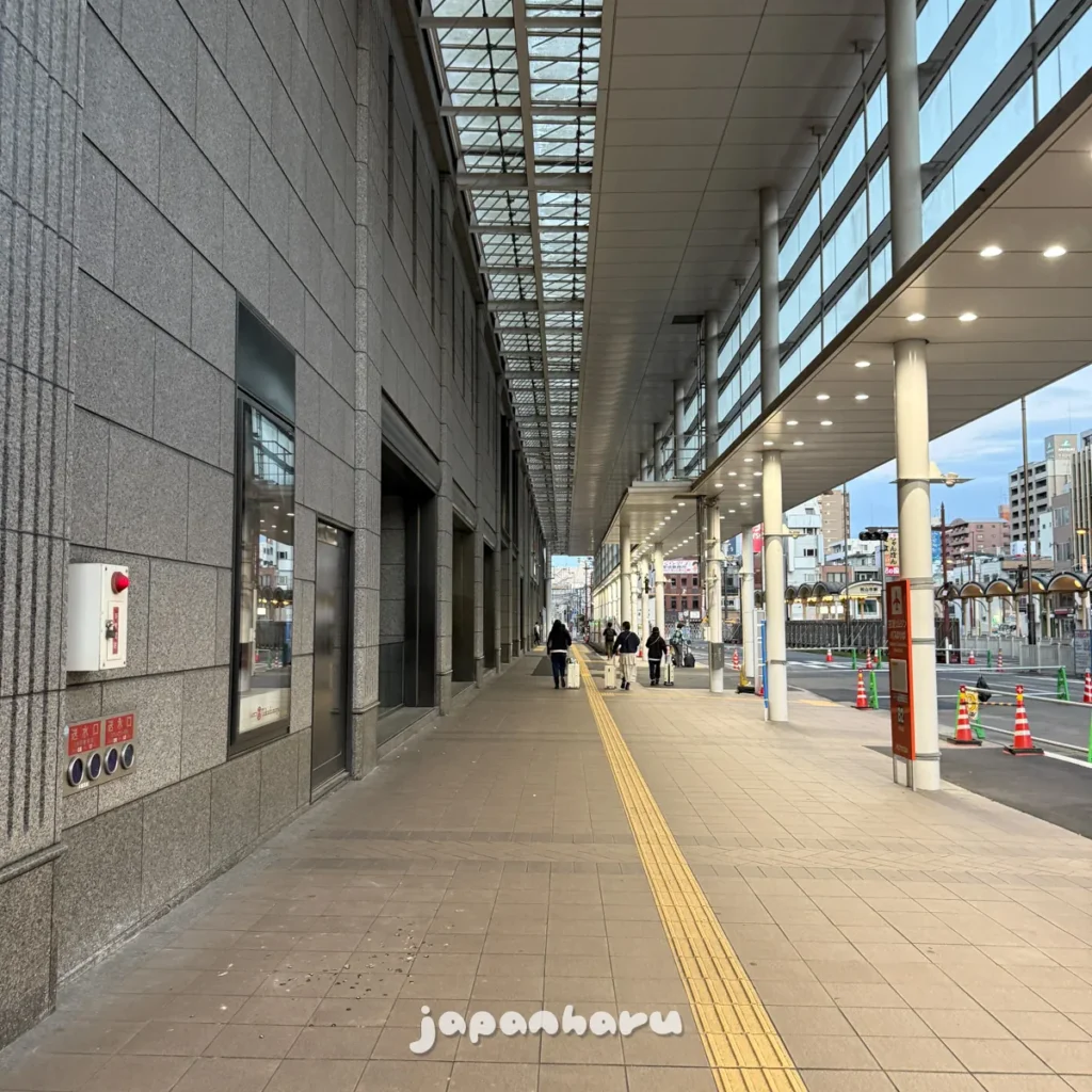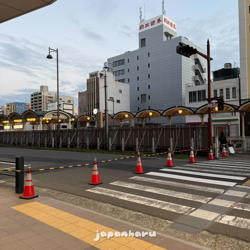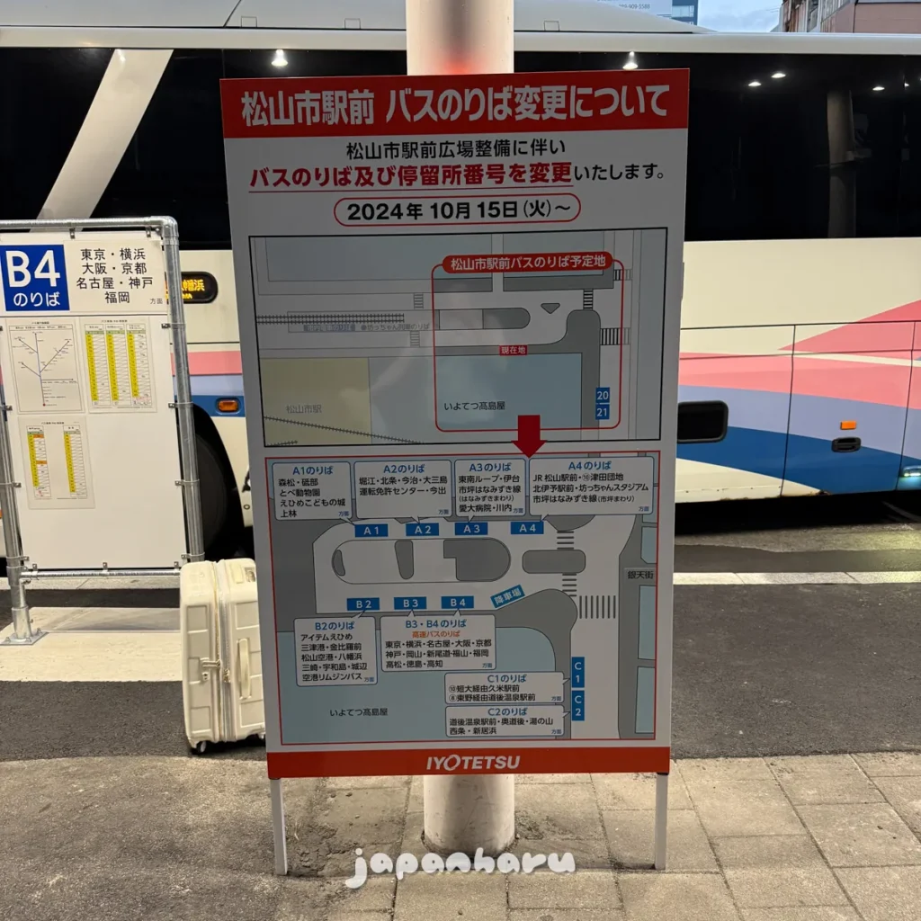 하차는 마쓰야마시역 앞으로 했는데, 10월 15일부터 역 앞 공사를 하고 있어서 일시적으로 승하차 장소가 바뀌었어요!