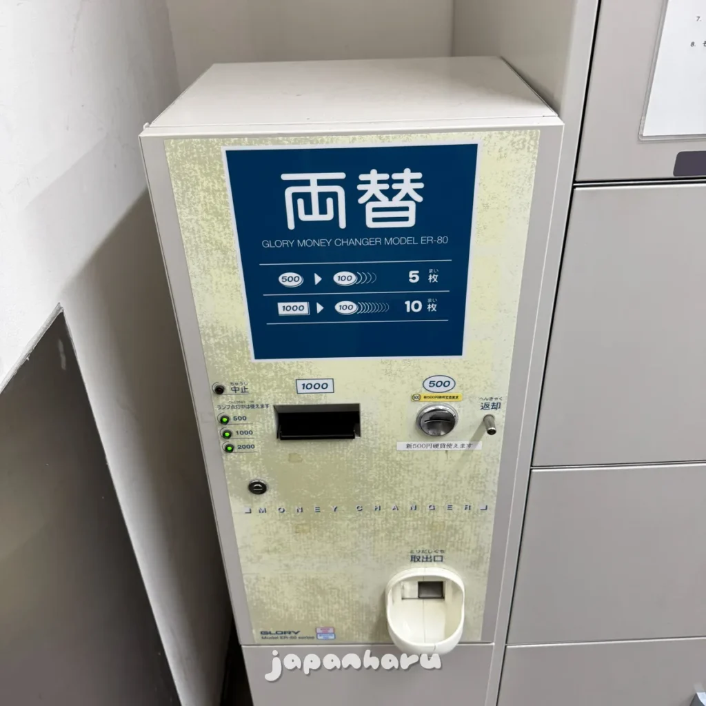 동전교환기가 있는데, 1,000엔짜리와 500엔짜리를 100엔짜리로 바꿀 수 있어요.