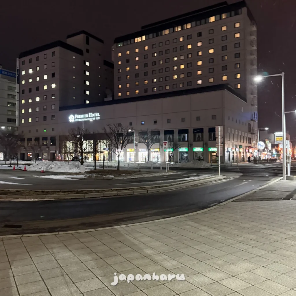 하코다테역에서 나와서 오른쪽을 보면 보이는 호텔 ‘프리미어 호텔’이에요.
