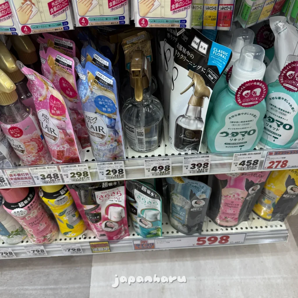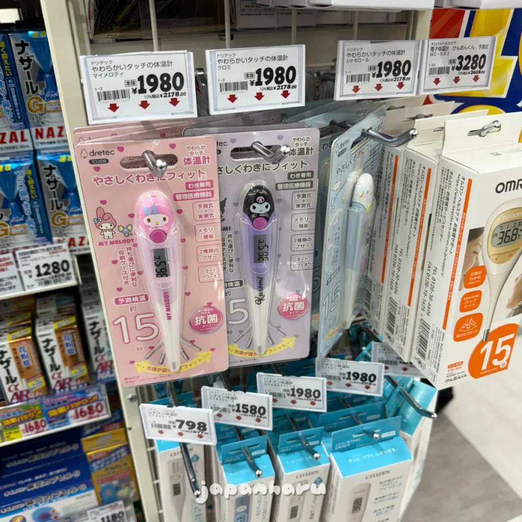 일본에서 세제로도 유명한 ‘란도린’의 섬유탈취제 버전도 있고, 캐릭터가 그려진 체온계도 있네요.