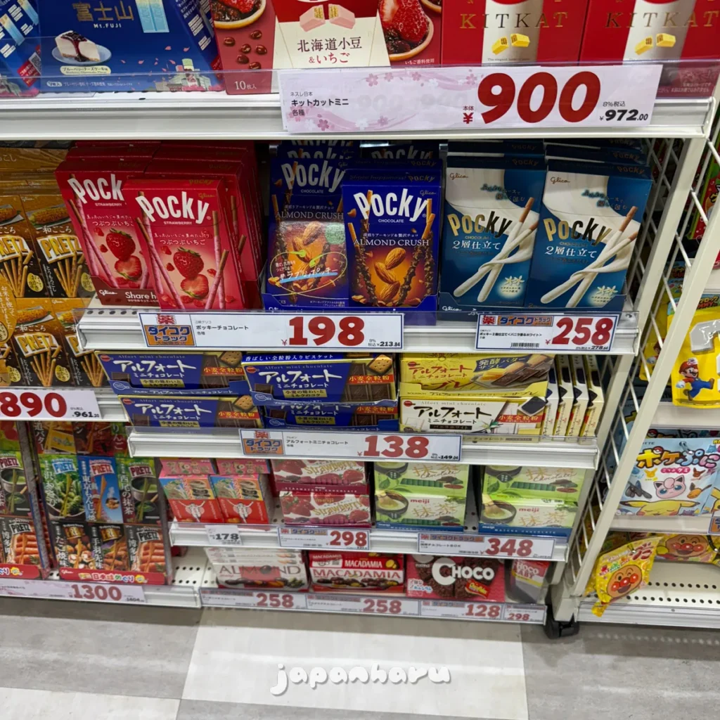 빼빼로 일본버전이라 할 수도 있는 포키(포키가 원조라곤 하지만 빼빼로라고 하는게 알기 쉬울테니 😅), 바삭한 비스킷 위에 초콜릿이 올라가 있는 ‘알포트 초콜릿’도 보이네요.