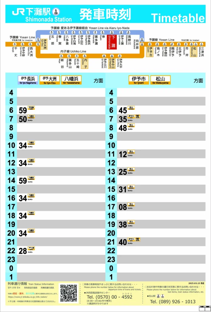 일본의 많은 지방도시의 교통편이 그렇지만, 마쓰야마에서 시모나다로 가는 열차도 하루에 상행/하행 각 9편 정도이기 때문에 방문하려면 미리 시간표를 숙지하고 있는게 좋기에 정리해봤어요!