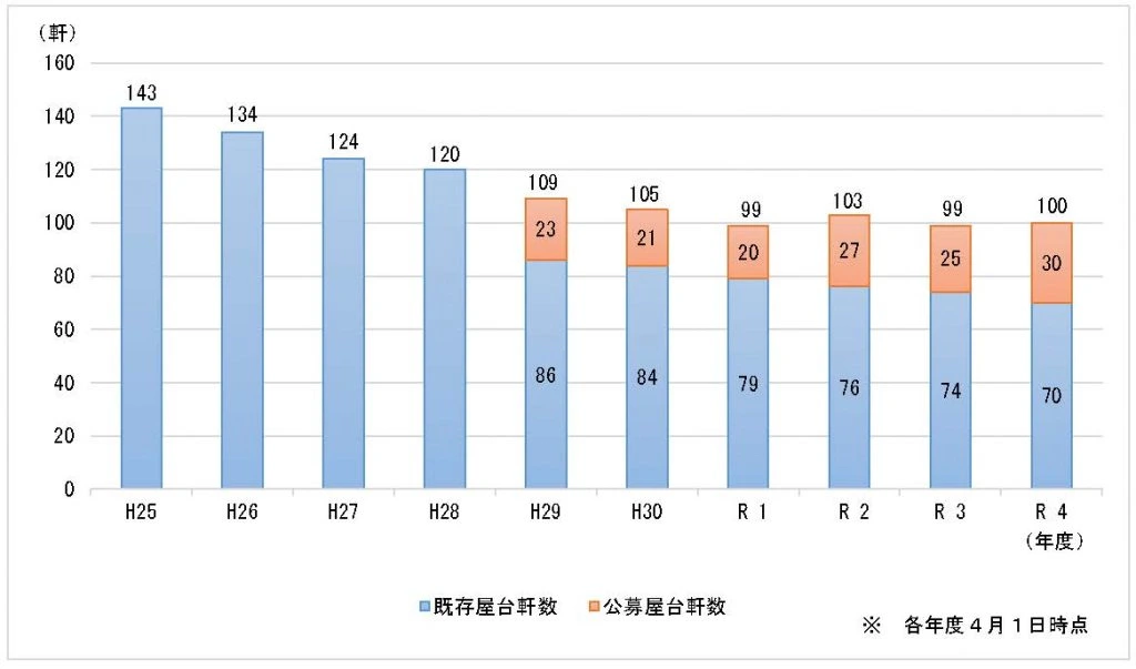 후쿠오카시에서 발표한 자료에 따르면, 현재는 줄어드는 야타이에 더해 신규로 공모하여 개점하는 야타이를 합쳐 약 100여 개의 야타이가 영업중이에요.