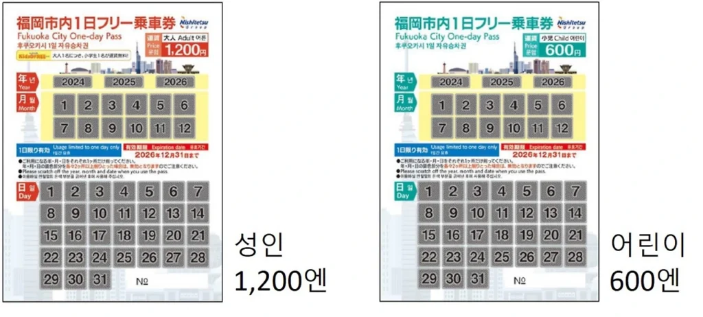 | 금액 (종이권) | 1,200엔(1일권) 2,100엔(다자이후 포함) |