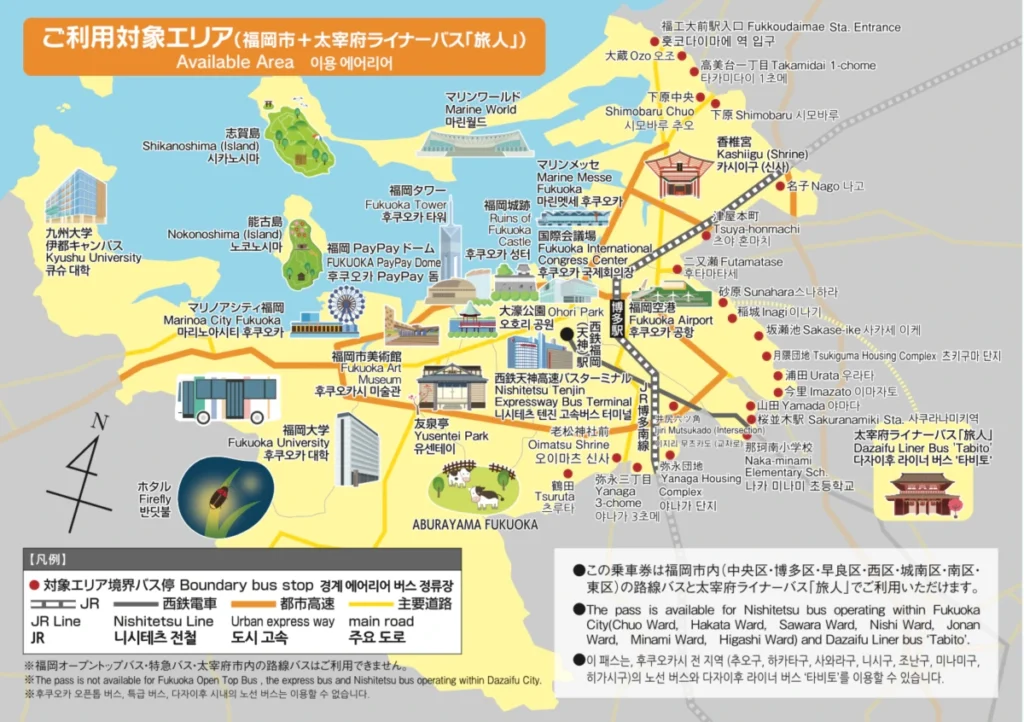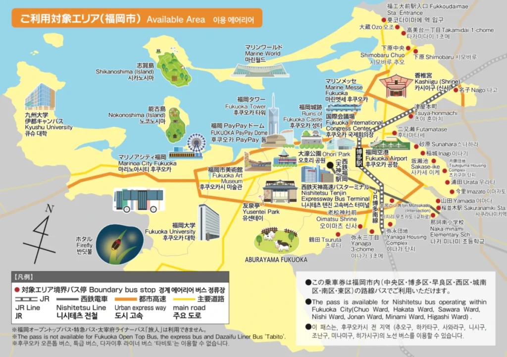 후쿠오카시 내의 모든 니시테츠 버스를 이용할 수 있어요!(공항-하카타 간 버스도 포함이에요!)