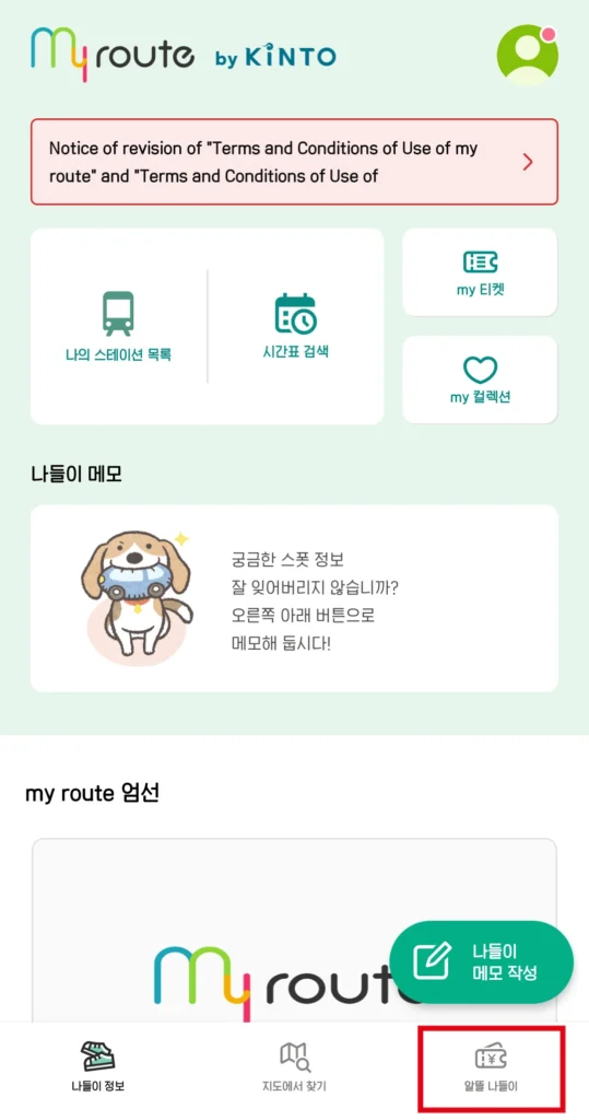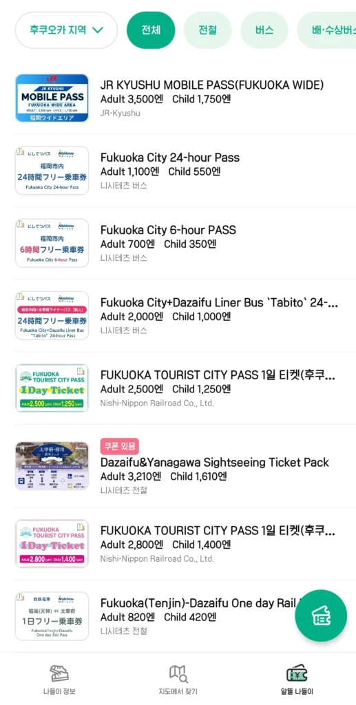 my route 앱에서 아래에서 3번째 메뉴 ‘알뜰 나들이’를 누르고 지역을 ‘후쿠오카 지역’으로 선택하면 아래와 같이 패스가 보여요!