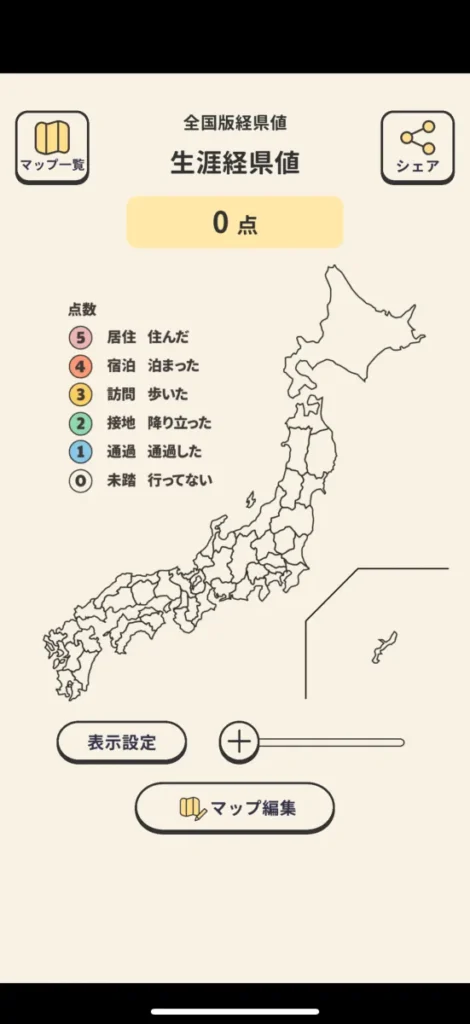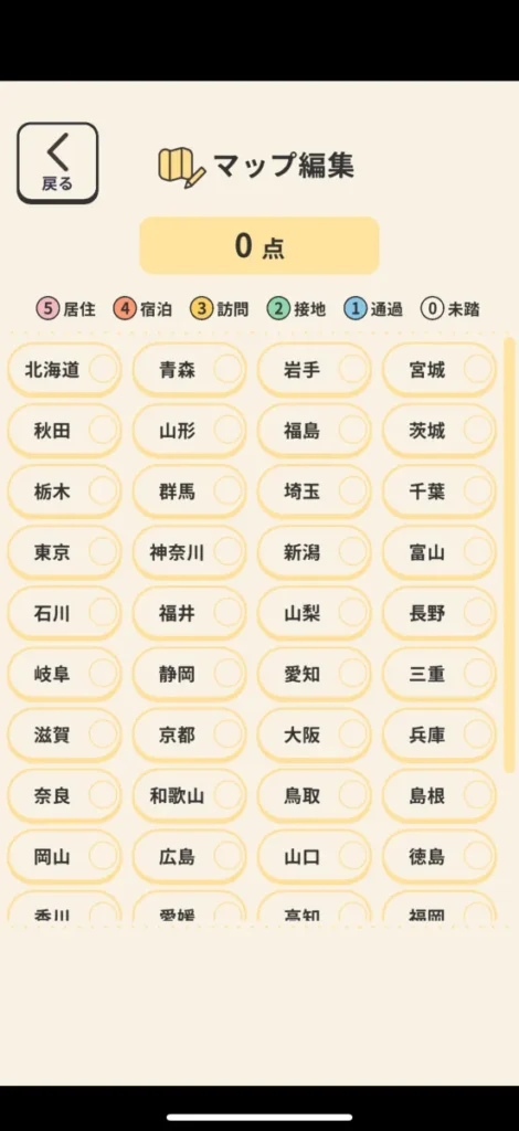 | 미답(未踏) | 0점 | 위의 그 어떤 경험도 없는 도도부현! (나에게 있어서 아직 미지의 도도부현!) |