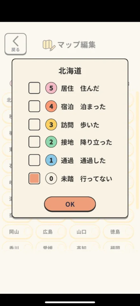 | 방문(訪問) | 3점 | 해당 도도부현에 방문해서 걸어다니거나 관광을 한 경험이 있어요! (관광은 했지만 숙박은 하지 않았다면 여기!) |