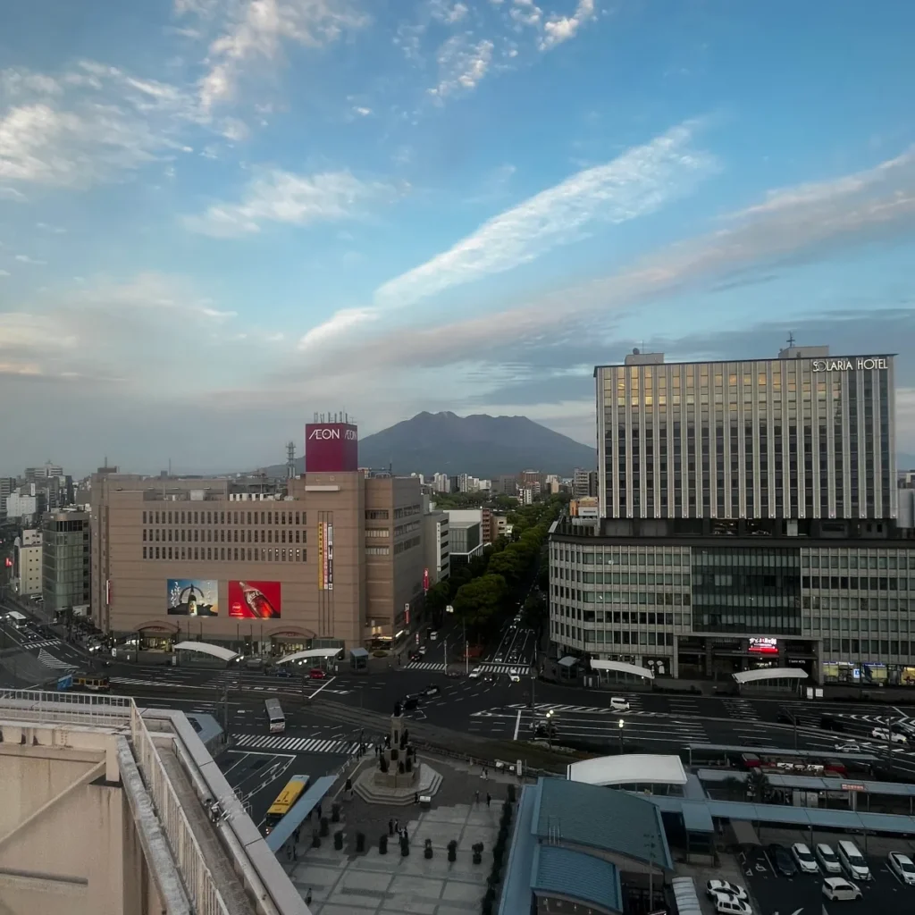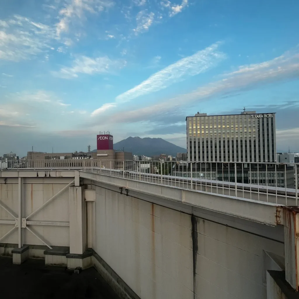 가고시마추오역에서 길 건너편으로 이어진 육교? 비슷한 곳에서 찍은 모습인데, 타러 가기 전에 비해 많이 어두워졌어요.